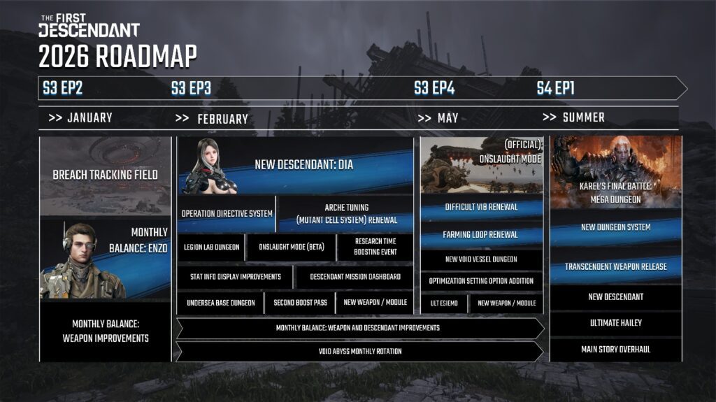 The First Descendant hat im großen Dev-Livestream eine umfangreiche Roadmap für das erste Halbjahr 2026 bekommen. Dich erwarten ein überarbeitetes Kern-Gameplay, ein neuer Onslaught-Modus, stärkere Endgame-Herausforderungen, verbesserte Farming-Mechaniken, eine neue Nachfahrin namens Dia und ein komplett renoviertes Waffensystem. Außerdem steht im Dezember ein großes Update mit Ultimate Yujin, dem Dungeon „Forbidden Sanctuary“, dem neuen Koloss „Grim Reaper“ und zahlreichen Balance-Anpassungen an.