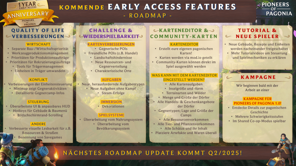 Für 2025 hat das Team von Envision Entertainment einiges geplant. Neben ständigen Verbesserungen des Spiels wird eine von der Community oft gewünschte Story-Kampagne zum 1.0 Release veröffentlicht, die von einem renommierten Fantasy-Autor geschrieben wird. Zudem wird umfangreicher Modding-Support integriert und das nächste Roadmap-Update ist für das 2. Quartal 2025 geplant. Im Frühjahr 2025 wird aufgrund der erheblichen Menge an hinzugefügtem Content der Verkaufspreis von Pioneers of Pagonia erhöht.